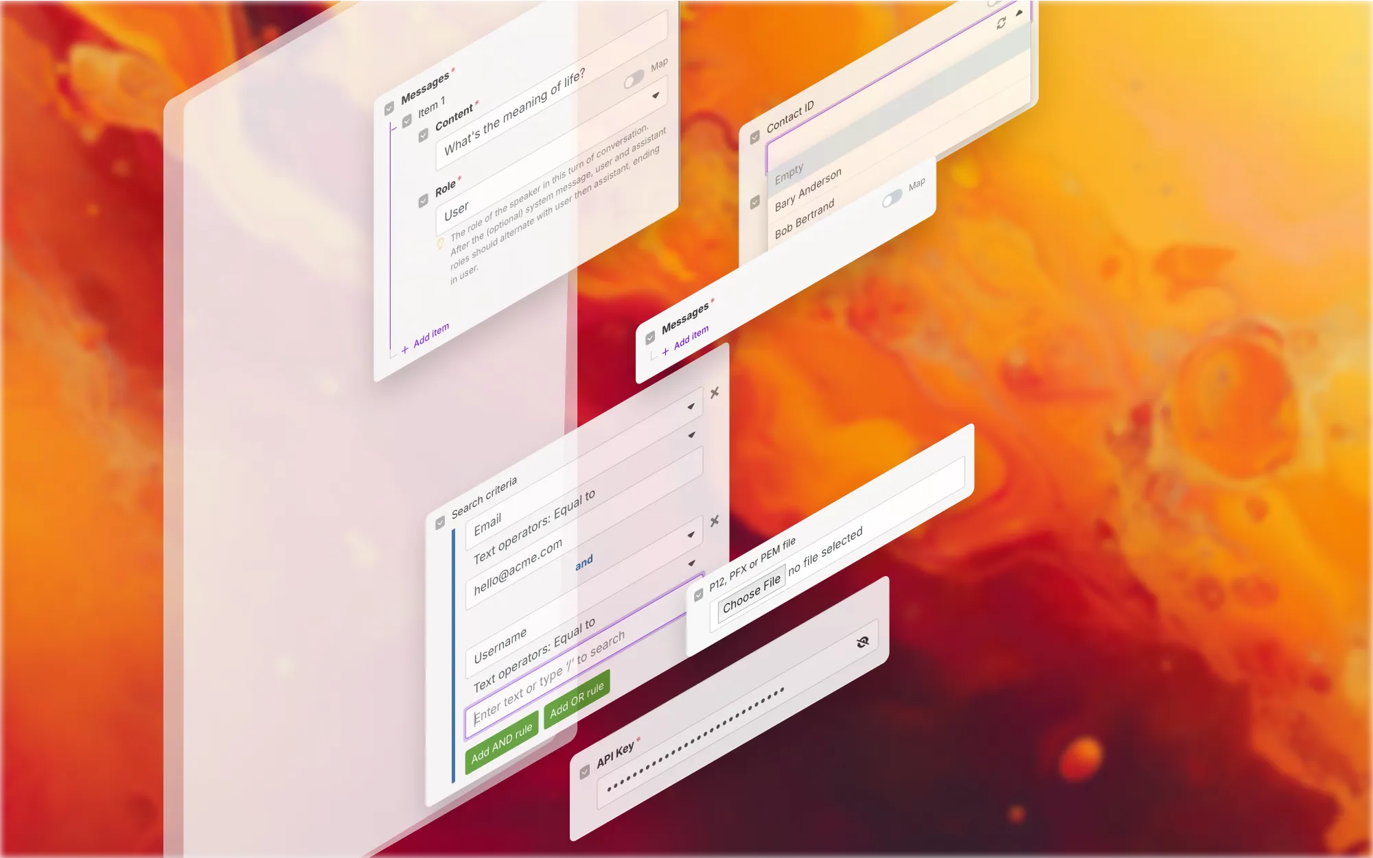 These information-rich input control panels are unique to each action of each app, and help a builder structure their API request for a successful first run.