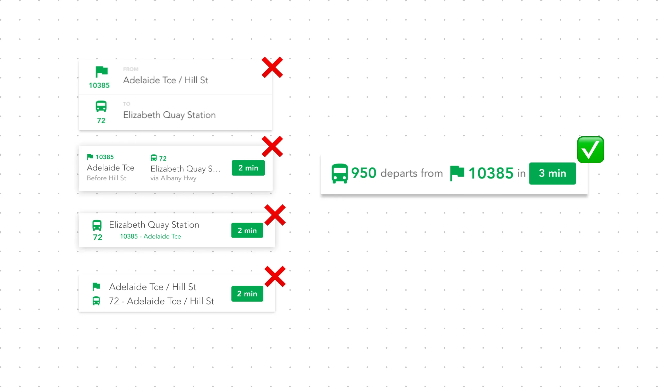 - Frequently switch between modes (bus today, train tomorrow) and need flexible, multi-modal support. Accessibility and simplicity were prioritized to serve the lowest common denominator of tech literacy.